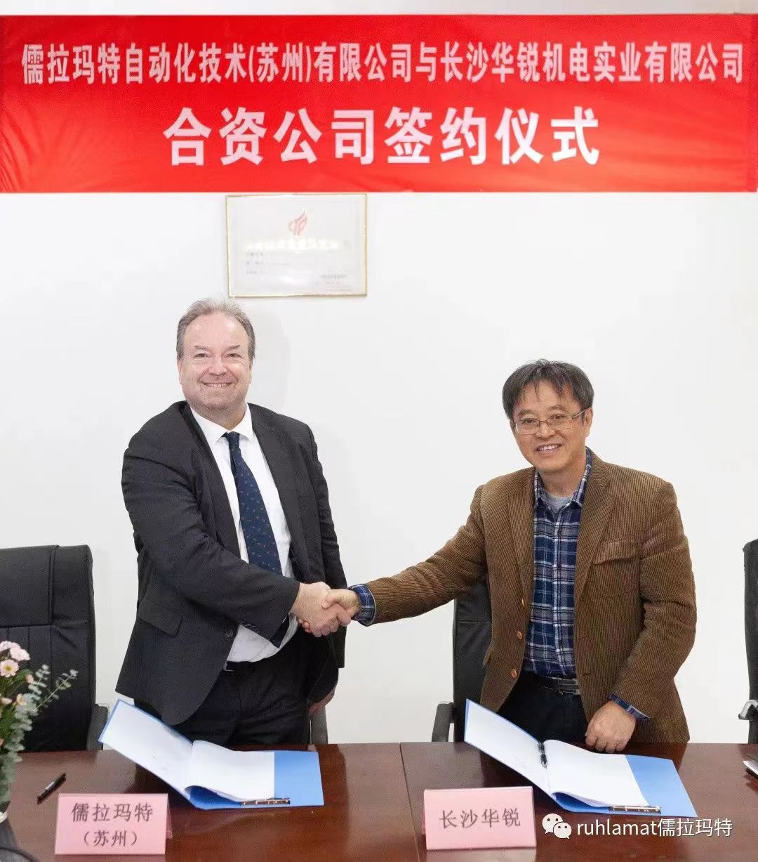儒拉瑪特自動(dòng)化技術(shù)(蘇州)有限公司與長(cháng)沙華銳機電實(shí)業(yè)有限公司在長(cháng)沙舉辦了合資公司簽約儀式,儒拉瑪特(蘇州)董事總經(jīng)理白世泰先生與長(cháng)沙華銳總經(jīng)理王小明先生簽署合作協(xié)議。